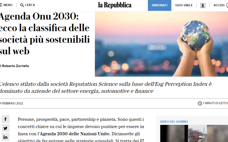 L’indagine è di Reputation Science (società specializzata nell’analisi e gestione della reputazione) che ha prodotto l’elenco attraverso l’analisi dell’Esg (Environmental, Social e Governance) Perception Index. L’indice analizza le azioni messe in campo da un’azienda nell’ottica della sostenibilità ambientale, dell’impatto sociale e dell’applicazione dei principi etici.