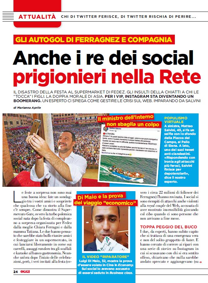 Anche i Re dei social prigionieri nella Rete2 Novembre 2018 Vip e reputazione online: gli errori più comuni delle star sui social e i consigli di Andrea Barchiesi per non restare imprigionati nella Rete. L’intervista su OGGI.