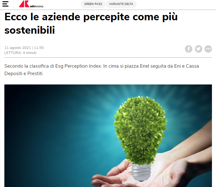 Il modello di analisi valuta la prossimità del brand ai 17 pillar della sostenibilità definiti dall’Onu e produce per ciascuna un indicatore (da 0 a 100). Nell’ultimo periodo di analisi (gennaio-giugno 2021), Reputation Science ha analizzato oltre 1,2 milioni di contenuti online in lingua italiana per stilare una classifica delle 200 aziende più sostenibili sul web. A guidare il raking Esg Perception Index, i settori Energia, Automotive e Finance, che da soli occupano l’85% delle prime 20 posizioni.