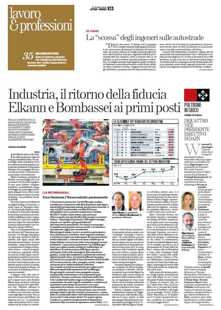 John Elkann è primo nella classifica della reputazione online dei manager industriali italiani. Nel mese di luglio, infatti, il presidente di Fca ha confermato la prima posizione nella speciale graduatoria di Reputation Manager con un punteggio di 61,92, e con una crescita di 3,79 punti sul mese precedente.