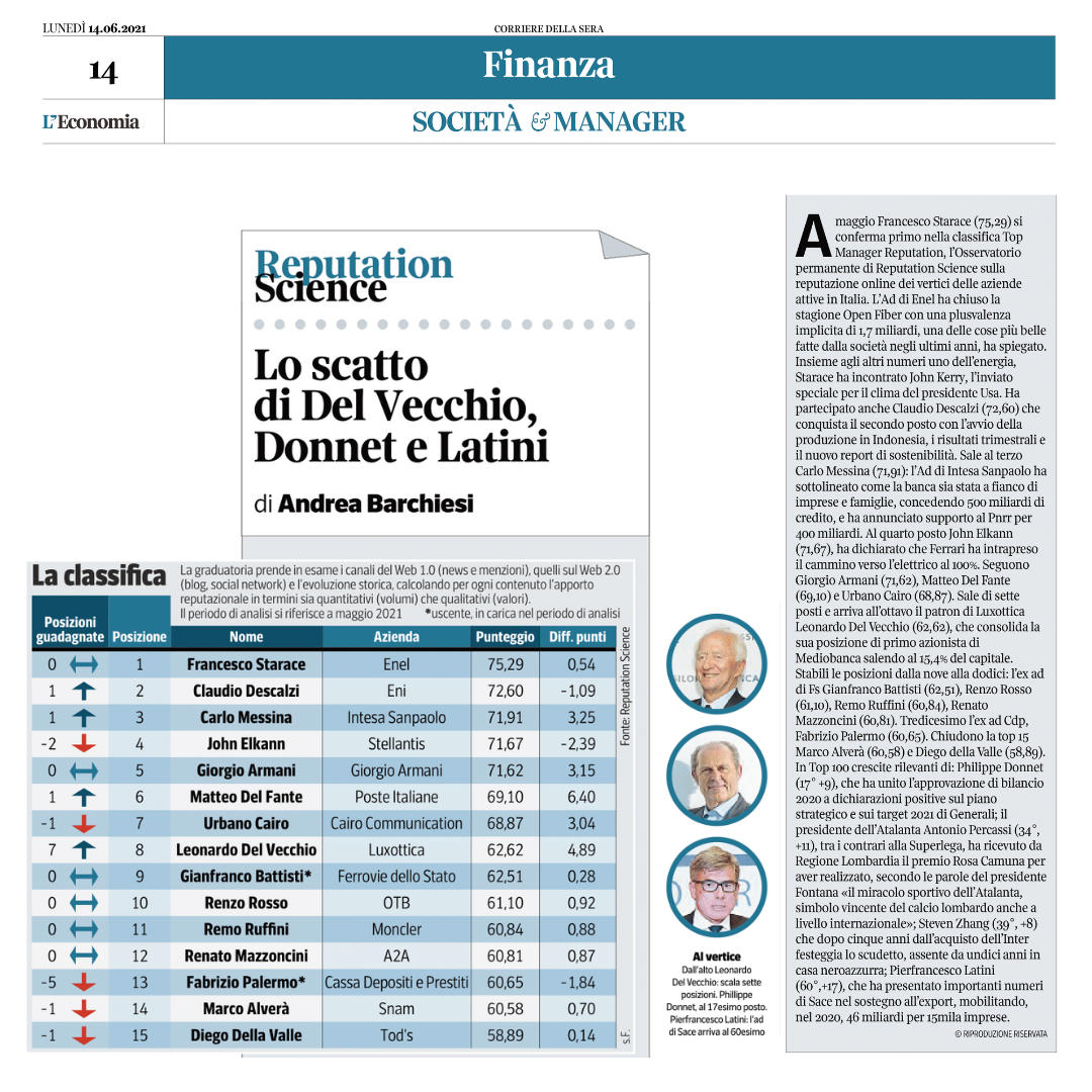 A maggio Francesco Starace (75,29) si conferma primo nella classifica Top Manager Reputation, l’Osservatorio permanente di Reputation Science sulla reputazione online dei vertici delle aziende attive in Italia. L’Ad di Enel ha chiuso la stagione Open Fiber con una plusvalenza implicita di 1,7 miliardi, una delle cose più belle fatte dalla società negli ultimi anni, ha spiegato. Insieme agli altri numeri uno dell’energia, Starace ha incontrato John Kerry, l’inviato speciale per il clima del presidente Usa. Ha partecipato anche Claudio Descalzi (72,60) che conquista il secondo posto con l’avvio della produzione in Indonesia, i risultati trimestrali e il nuovo report di sostenibilità. Sale al terzo Carlo Messina (71,91): l’Ad di Intesa Sanpaolo ha sottolineato come la banca sia stata a fianco di imprese e famiglie, concedendo 500 miliardi di credito, e ha annunciato supporto al Pnrr per 400 miliardi.