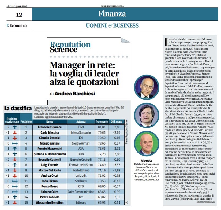 A dicembre Francesco Starace (81,81) sale di due posizioni, guadagnando il vertice della classifica Top Manager Reputation, l’osservatorio permanente di Reputation Science. L’ad di Enel ha presentato il piano strategico 2023-2025 e commentato i 60 anni dell’azienda, che ha anche raggiunto il suo punteggio più alto di sempre nel Dow Jones Sustainability World Index.