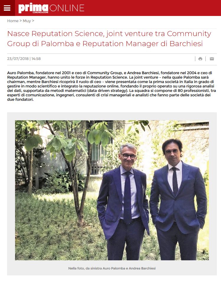 Auro Palomba, fondatore nel 2001 e ceo di Community Group, e Andrea Barchiesi, fondatore nel 2004 e ceo di Reputation Manager, hanno unito le forze in Reputation Science. La joint venture – nella quale Palomba sarà chairman, mentre Barchiesi ricoprirà il ruolo di ceo – viene presentata come la prima società in Italia in grado di gestire in modo scientifico e integrato la reputazione online, fondando il proprio operato su una rigorosa analisi dei dati, supportata da metodi matematici (data driven strategy). La squadra si compone di 80 professionisti, tra esperti di comunicazione, ingegneri, consulenti di crisi manageriali e analisti che fanno parte delle società dei due fondatori.