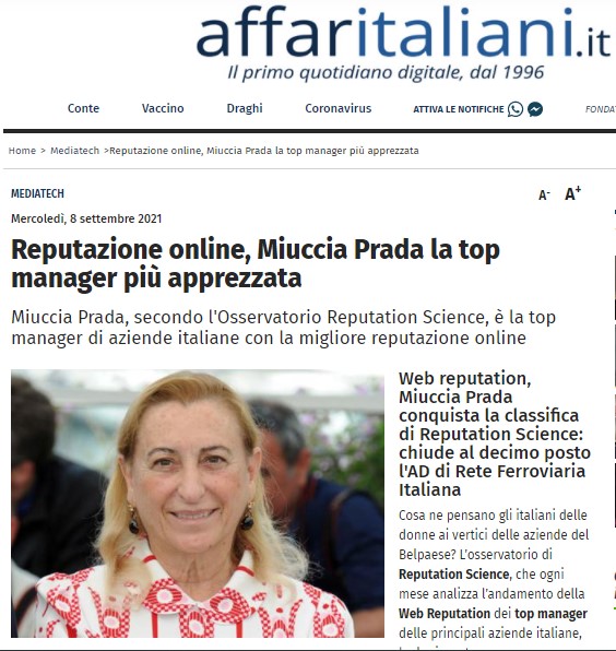Qual è la reputazione online delle donne ai vertici delle aziende italiane? Secondo l’osservatorio di Reputation Science – che ogni mese analizza l’andamento della Web Reputation dei top manager delle principali aziende italiane – tra le prime dieci donne ad agosto si conferma al primo posto Miuccia Prada (55.58). La stilista, forte del balzo degli utili della società, che ha fatto registrare un primo semestre da +60%, ha raccontato a Vogue la sua collaborazione con Raf Simons, dalla quale sono nate già due collezioni. Sale al secondo posto del podio, con un incremento di due posizioni anche nella classifica generale (www.topmanagers.it). Cristina Scocchia (53.19). L’Ad di Kiko, in un’intervista al Sole 24 Ore, ha rilanciato l’impegno dell’azienda nei confronti di ambiente e sostenibilità sociale, con un occhio di riguardo alle potenzialità dell’e-commerce. Terzo gradino del podio per la Presidente di MPS Patrizia Grieco (49.56), prima esponente del settore Finance a comparire in top 10, che con Assonime ha lanciato i nuovi principi per il dialogo tra le società quotate e i soci.