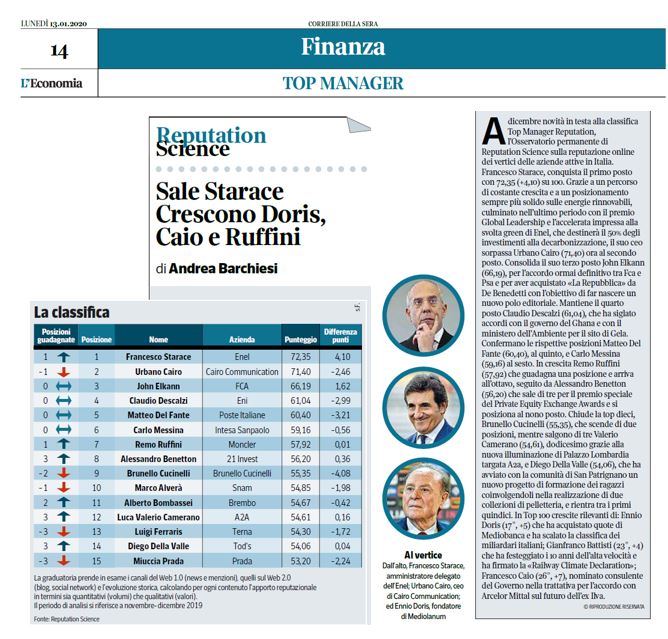 A dicembre novità in testa alla classifica Top Manager Reputation, l’Osservatorio permanente di Reputation Science sulla reputazione online dei vertici delle aziende attive in Italia. Francesco Starace conquista il primo posto con 72,35 (+4,10) su 100. Grazie a un percorso di costante crescita e a un posizionamento sempre più solido sulle energie rinnovabili, culminato nell’ultimo periodo con il premio Global Leadership e l’accelerata impressa alla svolta green di Enel, che destinerà il 50% degli investimenti alla decarbonizzazione, il suo AD sorpassa Urbano Cairo (71,40) che si ferma al secondo posto con menzioni per lo più in ambito calcistico. Consolida il suo terzo posto John Elkann (66,19), commentato positivamente per l’accordo ormai definitivo tra FCA e PSA e per aver acquistato La Repubblica da De Benedetti con l’obiettivo di far nascere un nuovo polo editoriale. Mantiene il quarto posto Claudio Descalzi (61,04), che ha siglato accordi con il governo del Ghana e con il Ministero dell’Ambiente per il sito di Gela. Confermano le rispettive posizioni Matteo Del Fante (60,40), al quinto, e Carlo Messina (59,16) al sesto.