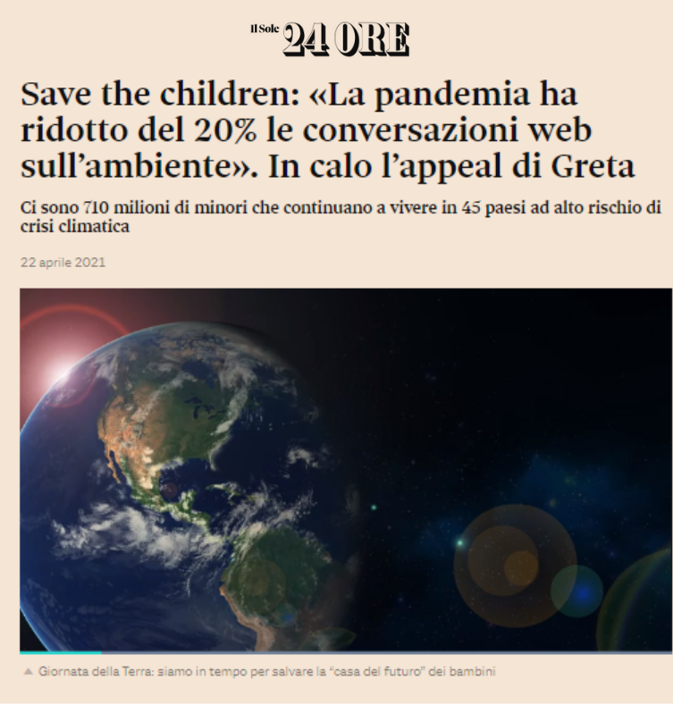 Le conversazioni sui social sul tema sono calate del 20% rispetto all’anno precedente, con punte di -50% per quelle sui cambiamenti climatici e di -73% sull’emergenza clima. E anche il riscaldamento globale è stato un tema meno dibattuto con un -49% rispetto al 2019. I dati sono contenuti nel report realizzato da Reputation Manager per Save the Children, diffuso in occasione della Giornata della Terra.