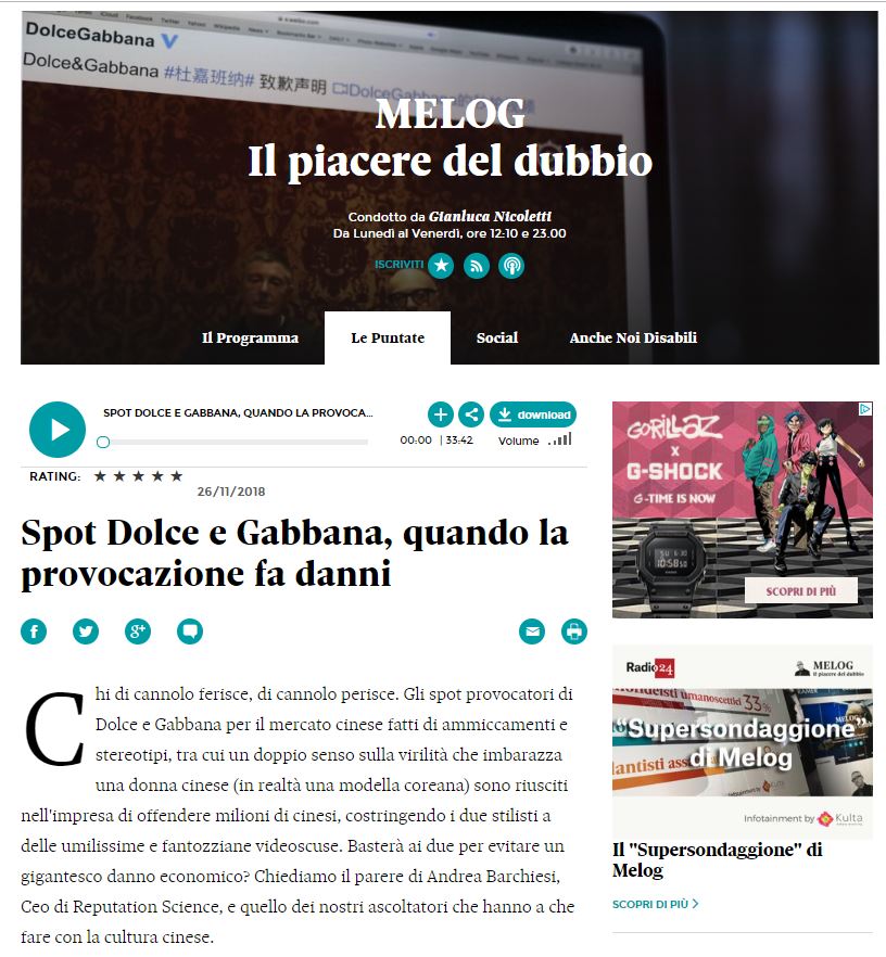 Chi di cannolo ferisce, di cannolo perisce. Gli spot provocatori di Dolce e Gabbana per il mercato cinese fatti di ammiccamenti e stereotipi, tra cui un doppio senso sulla virilità che imbarazza una donna cinese (in realtà una modella coreana) sono riusciti nell’impresa di offendere milioni di cinesi, costringendo i due stilisti a delle umilissime e fantozziane videoscuse. Basterà ai due per evitare un gigantesco danno economico? Chiediamo il parere di Andrea Barchiesi, Ceo di Reputation Science, e quello dei nostri ascoltatori che hanno a che fare con la cultura cinese.