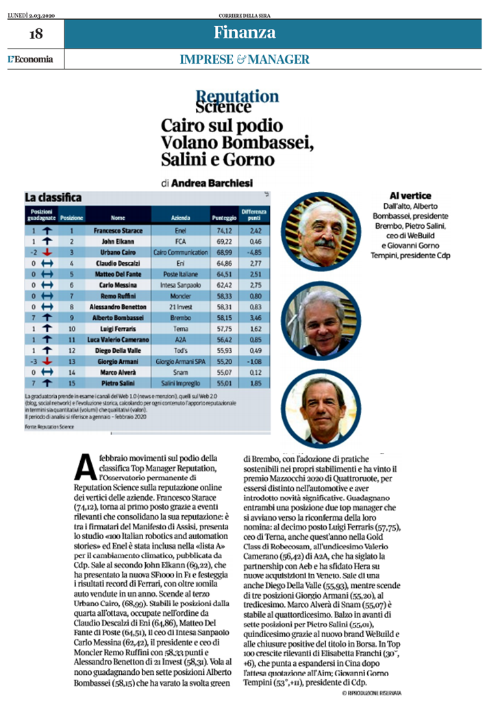 In febbraio si è mosso il podio della classifica Top Manager Reputation, l’Osservatorio permanente di Reputation Science sulla reputazione online dei manager ai vertici delle grandi aziende in Italia. Francesco Starace, amministratore delegato di Enel, torna al primo posto (74,12 punti su 100) grazie a eventi rilevanti che ne consolidano la reputazione: è tra i firmatari del Manifesto di Assisi, presenta lo studio «100 Italian robotics and automation stories» ed Enel è stata inclusa nella «lista A» per il cambiamento climatico, pubblicata da Cdp. Sale al secondo posto John Elkann (69,22), presidente e amministratore delegato di Exor, la holding della famiglia Agnelli: ha presentato la nuova SF1000 in F1 e festeggia i risultati record di Ferrari, con oltre 10mila auto vendute in un anno. Scende al terzo posto Urbano Cairo (68,99).