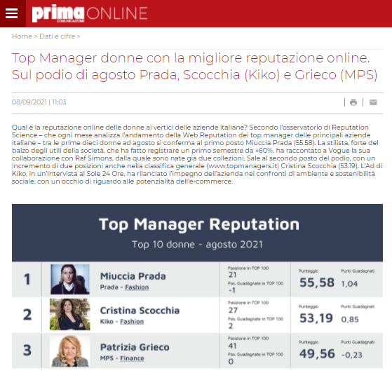 Qual è la reputazione online delle donne ai vertici delle aziende italiane? Secondo l’osservatorio di Reputation Science – che ogni mese analizza l’andamento della Web Reputation dei top manager delle principali aziende italiane – tra le prime dieci donne ad agosto si conferma al primo posto Miuccia Prada (55.58). La stilista, forte del balzo degli utili della società, che ha fatto registrare un primo semestre da +60%, ha raccontato a Vogue la sua collaborazione con Raf Simons, dalla quale sono nate già due collezioni. Sale al secondo posto del podio, con un incremento di due posizioni anche nella classifica generale (www.topmanagers.it) Cristina Scocchia (53.19). L’Ad di Kiko, in un’intervista al Sole 24 Ore, ha rilanciato l’impegno dell’azienda nei confronti di ambiente e sostenibilità sociale, con un occhio di riguardo alle potenzialità dell’e-commerce. Terzo gradino del podio per la Presidente di MPS Patrizia Grieco (49.56), prima esponente del settore Finance a comparire in top 10, che con Assonime ha lanciato i nuovi principi per il dialogo tra le società quotate e i soci.