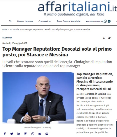 In questo clima, Claudio Descalzi, amministratore delegato di Eni, nella classifica top manager reputation, stilata dall’Osservatorio permanente di Reputation Science, che analizza e mette in fila i consensi online dei vertici delle aziende attive in Italia, sale così in prima posizione con oltre 80 punti. A seguire Francesco Starace, numero uno del colosso energetico Enel, ottiene 78.51 punti. Completa infine il podio il Ceo di Banca Intesa Sanpaolo, Carlo Messina, sotto di un solo punto a 77.48.