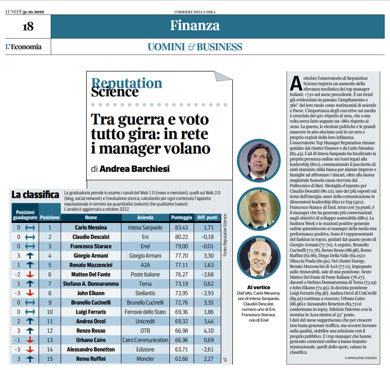 A ottobre, l’osservatorio di Reputation Science registra un aumento della rilevanza mediatica dei top manager italiani: +74% sul mese precedente. È un trend già evidenziato in passato: l’ampliamento a 360° del loro ruolo come testimonial di aziende e Paese. L’importanza degli executive sui media è cresciuta del 92% rispetto al 2021, che a sua volta aveva fatto segnare un +86% rispetto al 2020. La guerra, le elezioni politiche e le grandi manovre in atto sfociano così in un vero e proprio exploit della loro influenza.